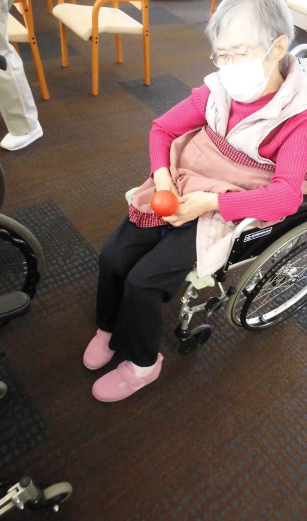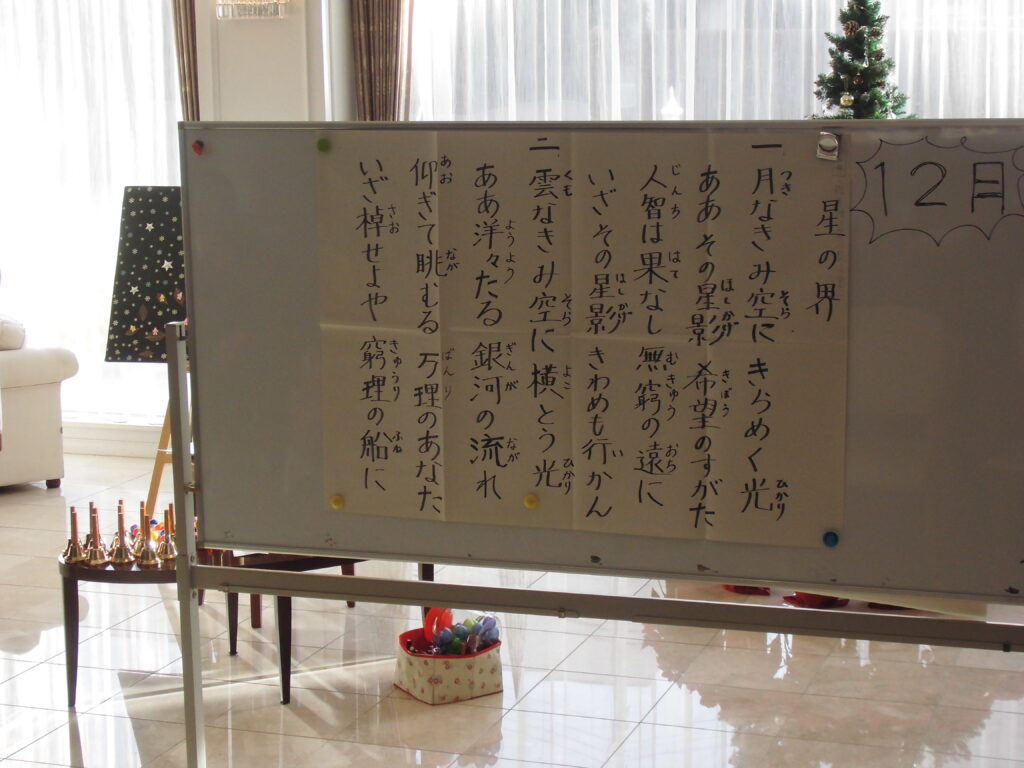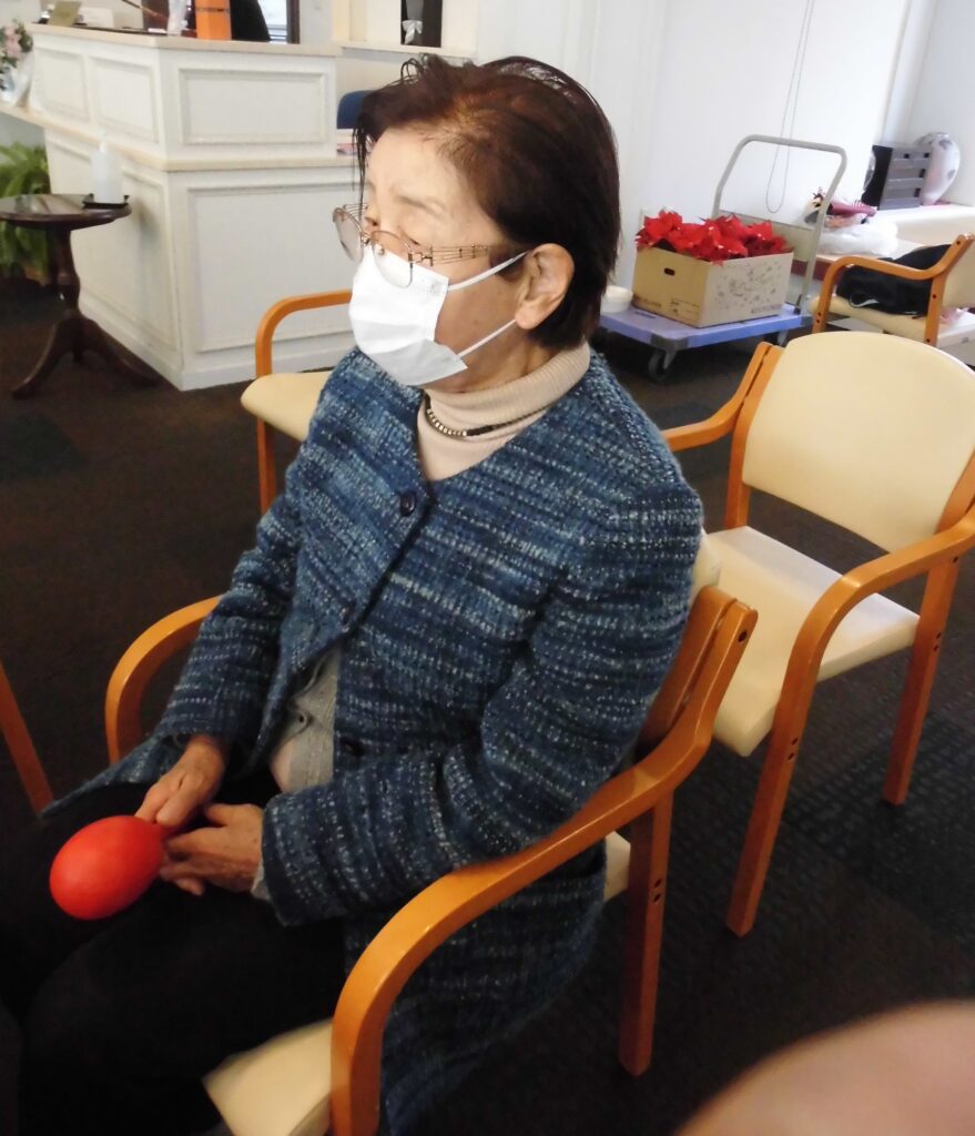 12月の音楽療法はクリスマスということで、先生もワンポイントでお洒落な赤いリボンを身につけての参加でした。いつもの「ハッピーバースデー」から始まり「雪の降る街を」「星の界」「きよしこの夜」リクエスト「ホワイトクリスマス」「荒野の果てに」「ジングルベル」と鈴やベルにぴったりな曲の数々。皆様楽しんで楽器を鳴らしておられました。