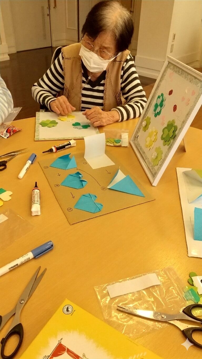 皆様、こんにちは。 日増しに春の訪れを感じる季節となりましたが、いかがお過ごしでしょうか。先日、当レジデンスでは恒例の「折り紙教室」を開催いたしました。 今回は、季節を感じる。作品名:クローバーとシロツメクサに挑戦。